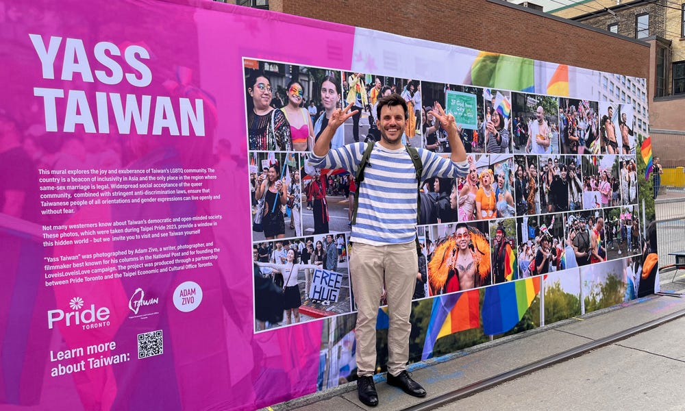 We produced a third mural in 2024, this time spotlighting Taiwan, the first Asian country to legalize same sex marriage. Pride Toronto chipped in around $1,500, with the Taiwanese embassy covering the rest of the budget. Again, I worked for free. (See above for an image of this display.)