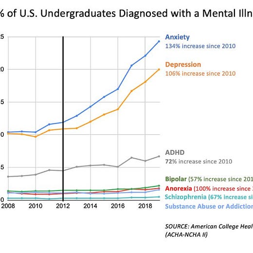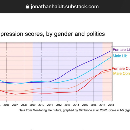 Boyle — a partner at Andreessen Horowitz — paired these charts with links to a series of reports and studies connecting these declines to a clutch of modern day problems, in particular rising levels of anxiety and depression, despair, most notably amongst the young.