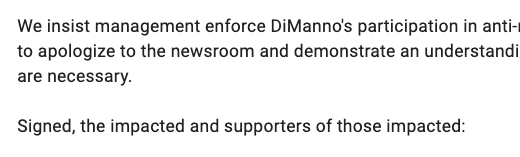 This could backfire — the signatories may have overreached. Sixty two people at The Star have demanded things management probably simply cannot deliver. The newsroom laid down explicit conditions. By our reckoning, unless DiManno chooses to play ball, there’s not much management can do to meet them. You can force DiManno to take anti-racism training, sure, but to apologize? To “demonstrate an awareness?” What does that even look like? So when this inevitably fails to deliver what has been demanded, what then for the 62? Will they send another letter? Go on a byline strike? Quit? What?