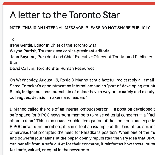 DiManno's email, of course, immediately leaked on Twitter. On Tuesday, a letter signed by 62 Star newsroom employees, sent to senior management, also leaked on Twitter. The signatories complained bitterly about DiManno's alleged bullying, and accused her of being “hateful” and racist for attacking Paradkar’s promotion.