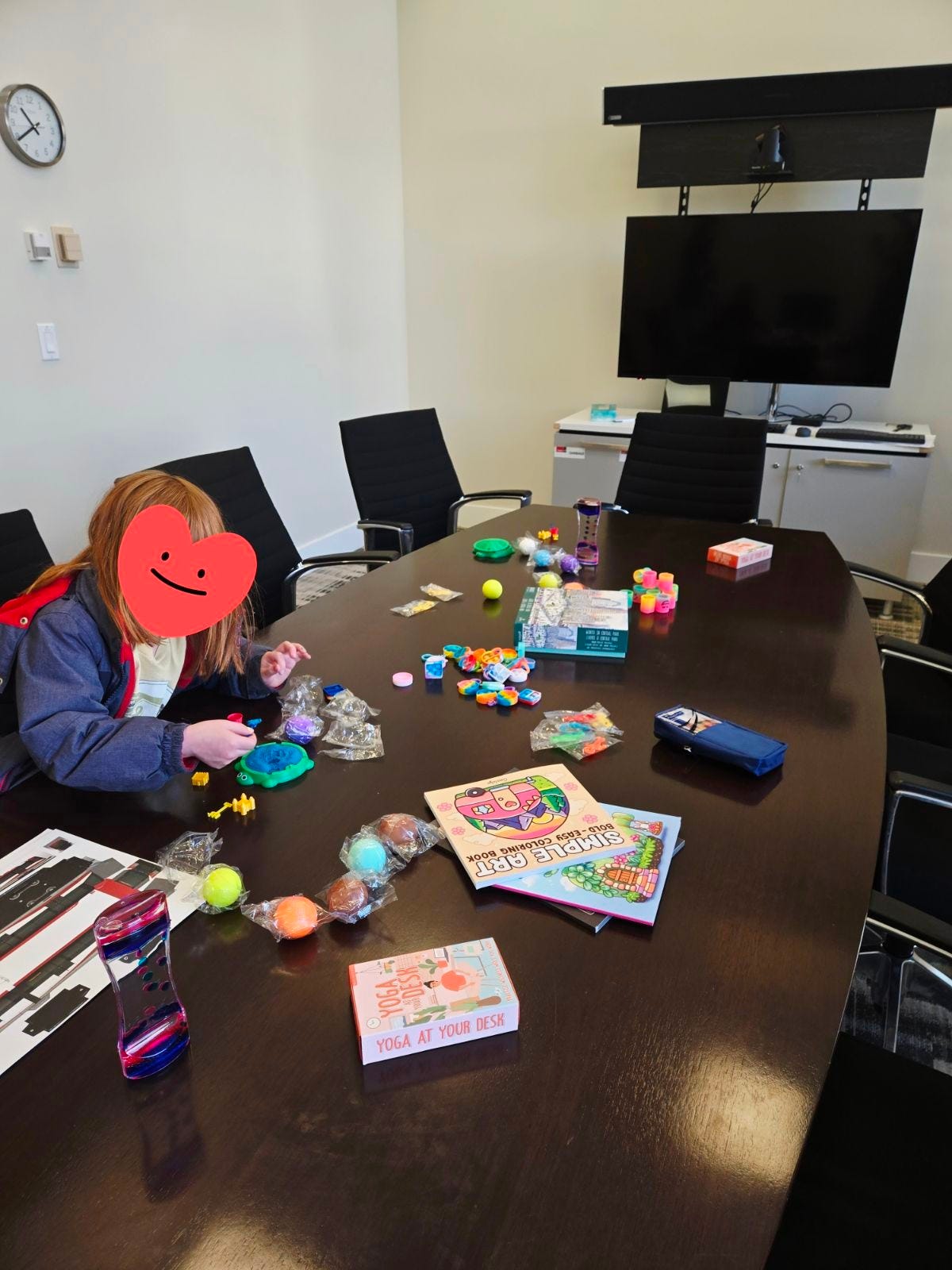 Shortly before we left, I took a picture of my daughter in the City of Calgary’s adult toy room. Then I tweeted it. We had a long car ride home, so I stole one of the stress balls and the Kinetic sand box because she is six years old and nobody in that office really ought to need those things — especially not at taxpayer’s expense.