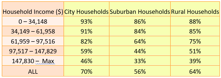 Statistics Canada’s consumer spending data measures carbon tax paid over which we can overlay the value of rebates for Ontario households. The table below segments Ontario residents by income quintiles and geography. It shows the percentage of residents in each group that receive larger rebates than they pay in carbon tax.