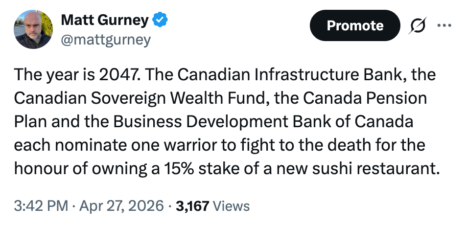 Then we created the Business Development Bank of Canada (BDC) specifically to increase the funds available for Canadian businesses looking to capitalize expansion, because (go figure) the private banks weren’t willing to take risks. Then we rolled out the Canadian Infrastructure Bank, which we needed because the BDC ended up being even more risk averse than the banks. Then we have all those regional economic development agencies. Meanwhile, the Canada Pension Plan is just aching to find quality investments with high returns for pensioners.