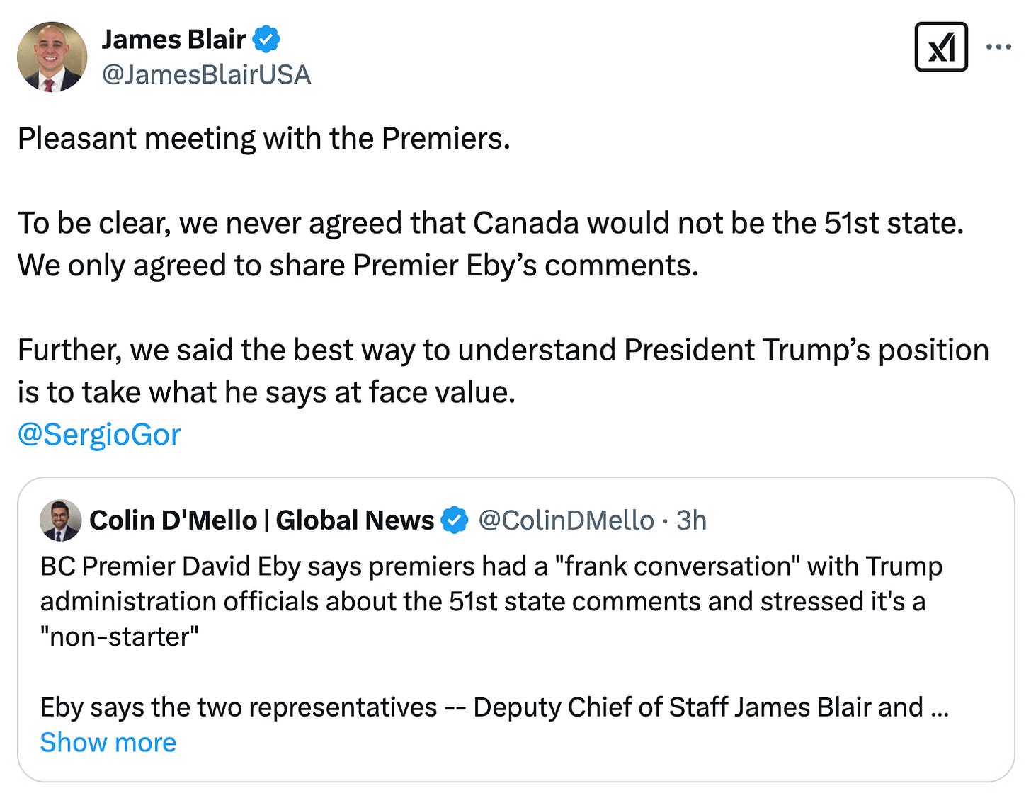 Canada's premiers went to Washington, D.C. this week, to meet with ... whomever would agree to see them, it turned out. The Team Canada delegation ended up scoring a meeting with James Blair, deputy White House chief of staff. That ain't nothing. But it's also a signal of where the White House rates Canada in terms of urgency. Our call is important to them, but we're going to be on hold listening to the canned music for a bit, seems to be about the size of it.