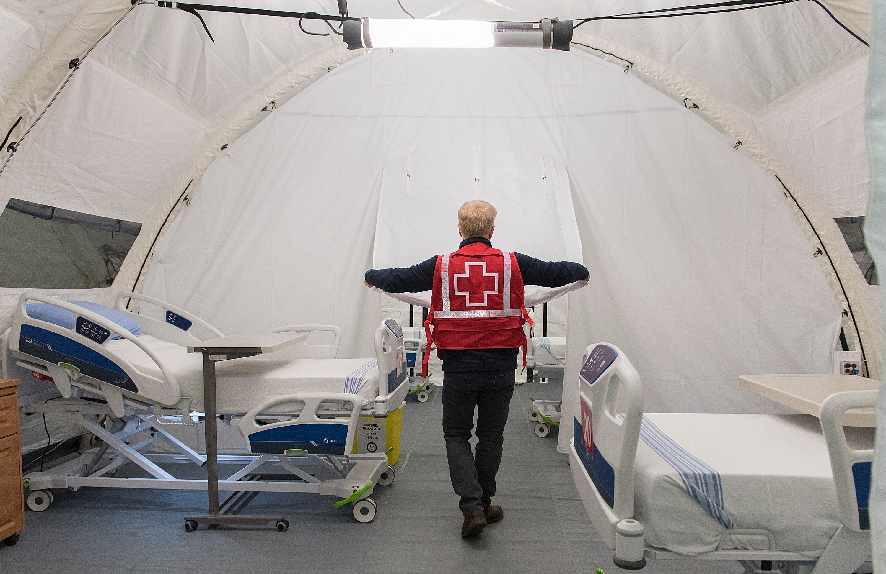 A Red Cross volunteer in a tent at a mobile hospital in the Montreal suburb of LaSalle, Sunday, April 26, 2020. THE CANADIAN PRESS/Graham Hughes.