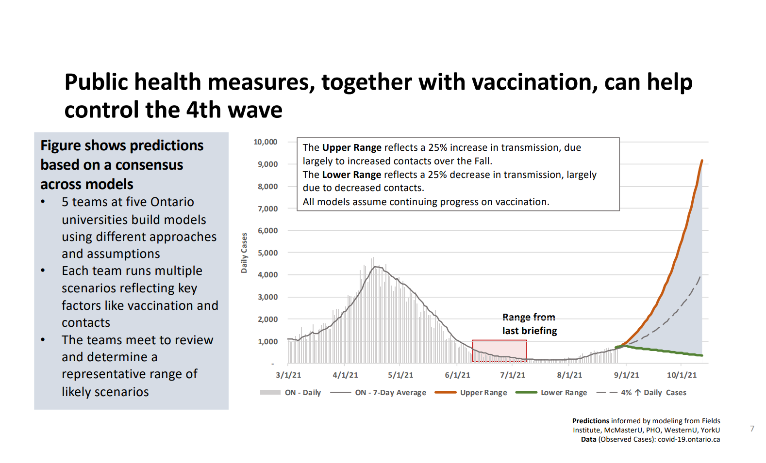 Last week, the Ontario Science Table released a chart predicting a range of possible scenarios as the province heads into its Delta-driven fourth wave. The chart, a highlight of a longer presentation, predicted anywhere from between 500 to 9,000 cases per day by next month, and it was presented with no supporting messaging explaining what everyday people could do with this information. I felt intense frustration. If I walked into a meeting with a huge range of potential outcomes and then said nothing about what it meant in practice, I would be hammered with questions. "What does this mean? What changes are more likely to move us towards the green? Which ones lead to red? What are the tangible things I need to know in order to make good choices?"